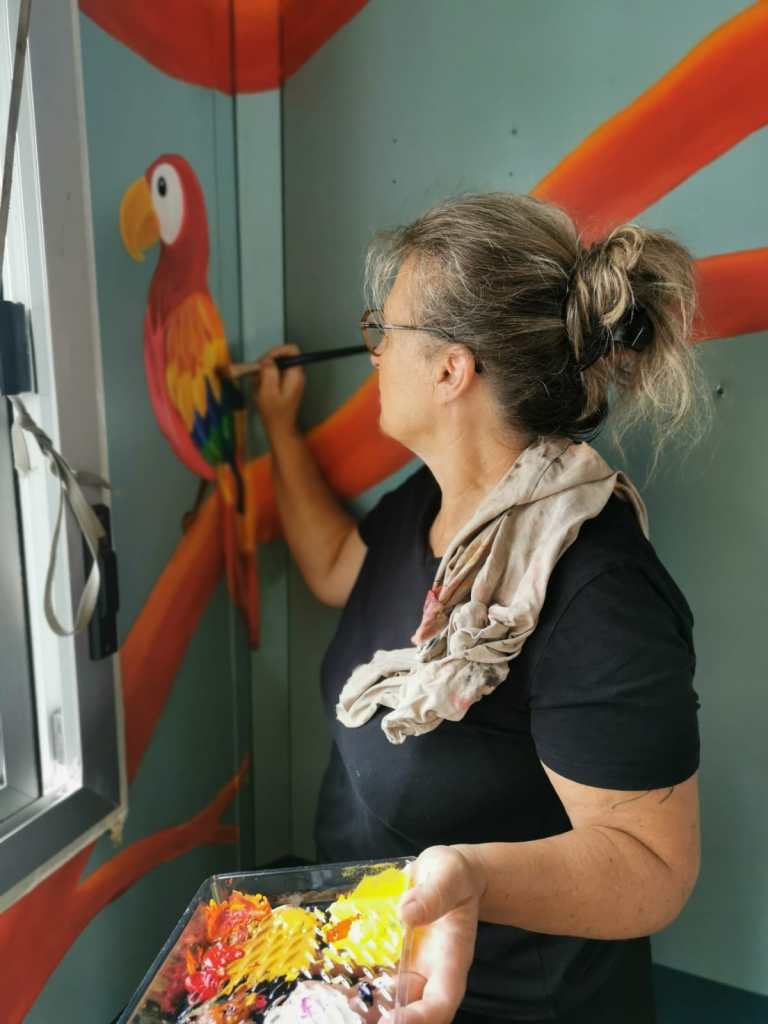 Je suis Valérie – alias Folk – artiste peintre, illustratrice et muraliste. Depuis plusieurs années, je conçois et réalise des fresques murales collaboratives dans des écoles, des centres de loisirs, des campings, des comités de quartier, ou encore des centres sociaux.