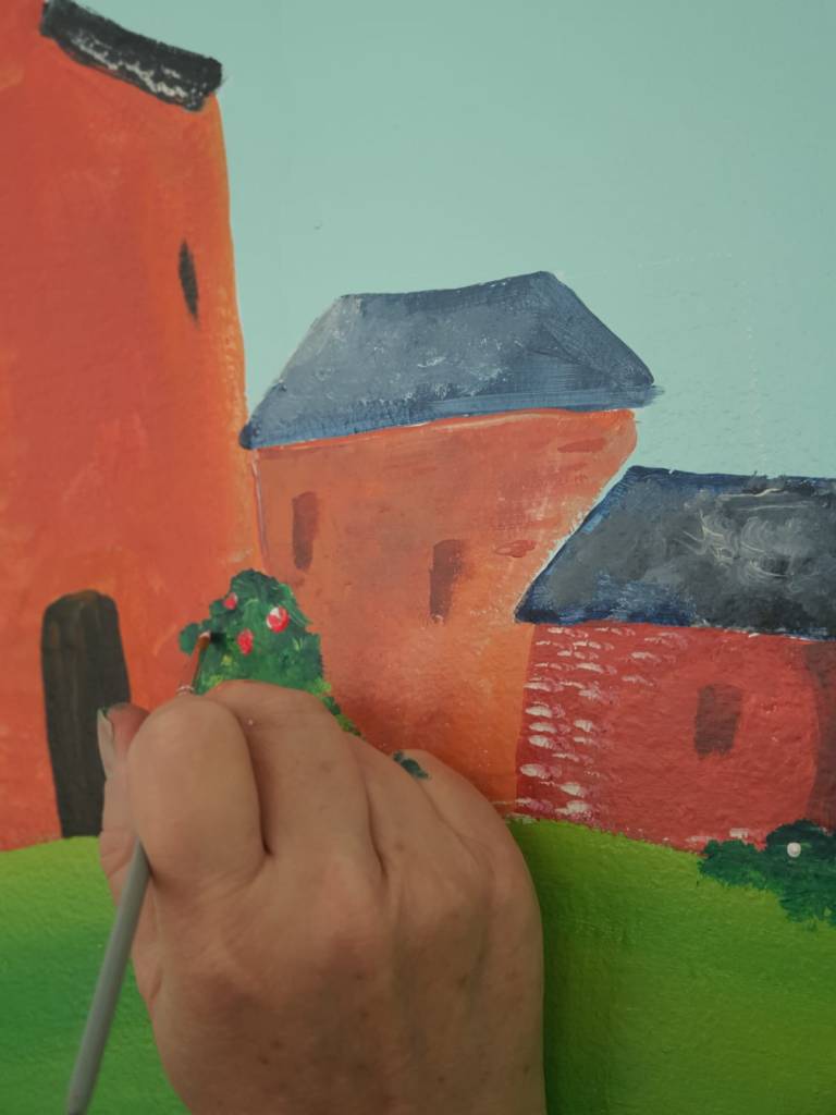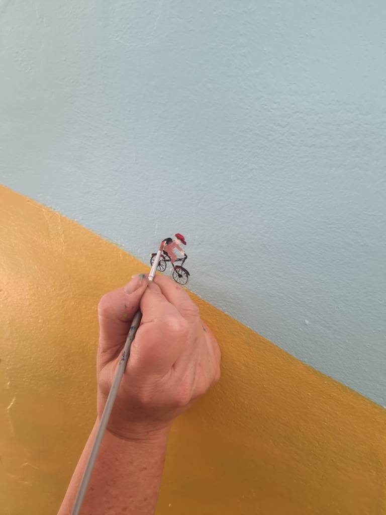 Quelques jours plus tôt, à Guise, c’est un paysage de campagne féerique que nous avons peint. Des collines, des châteaux, des vélos en goguette. Une scène douce et lumineuse, née de la poésie du lieu.