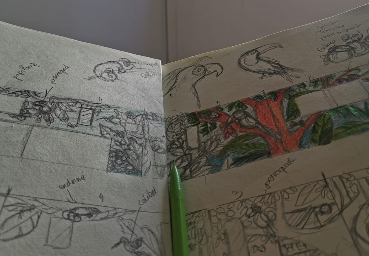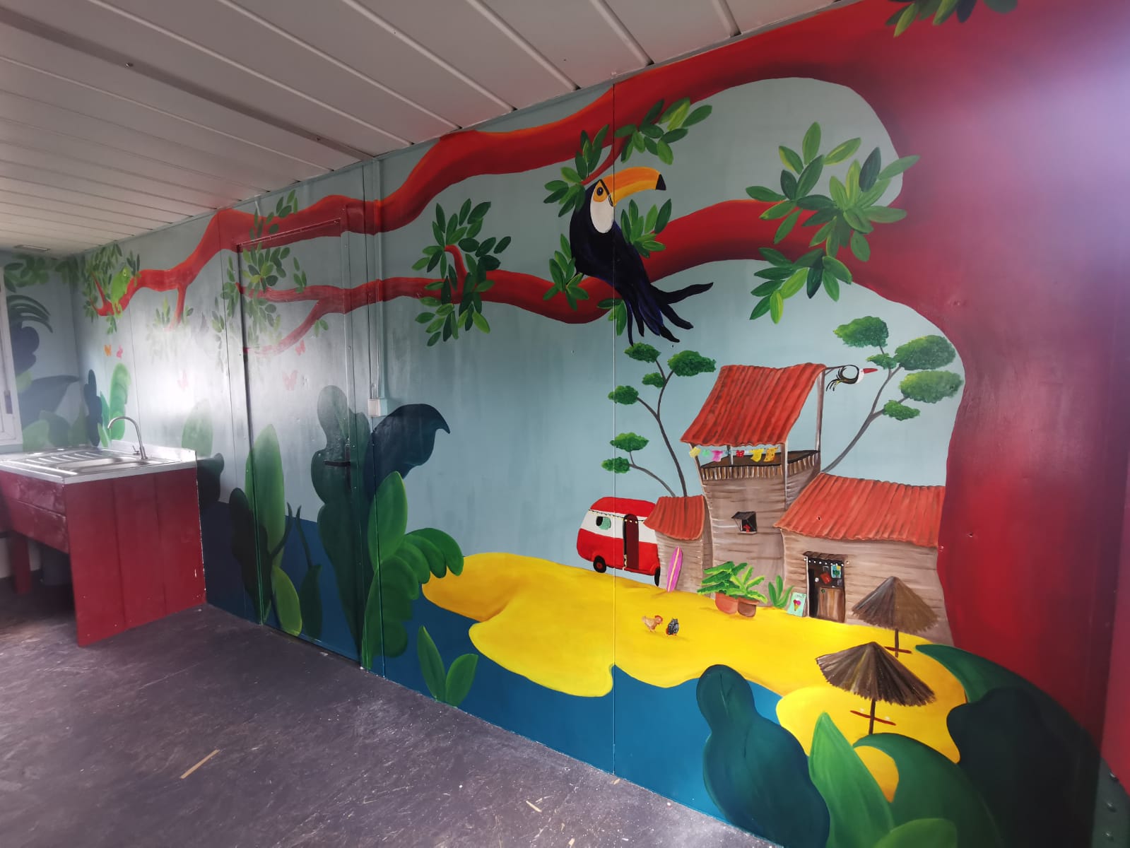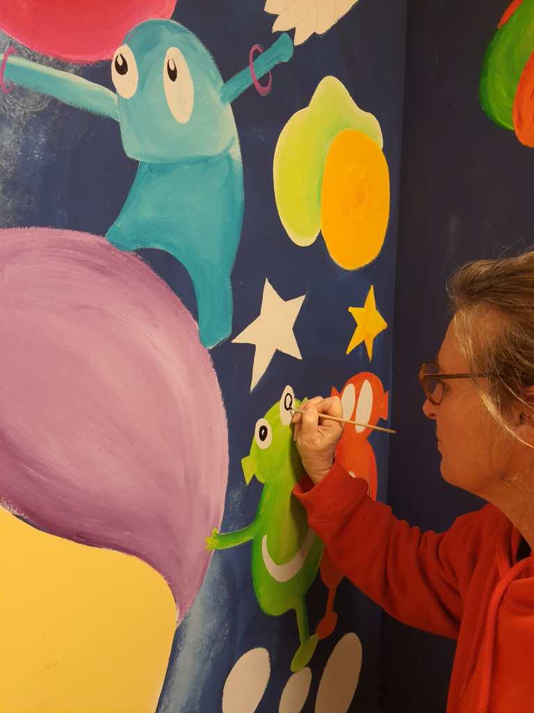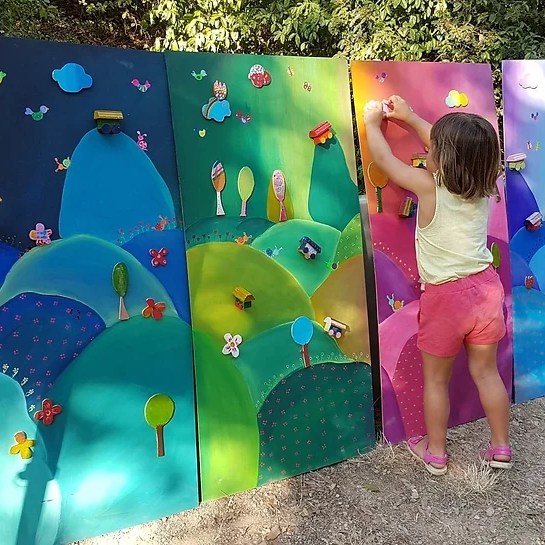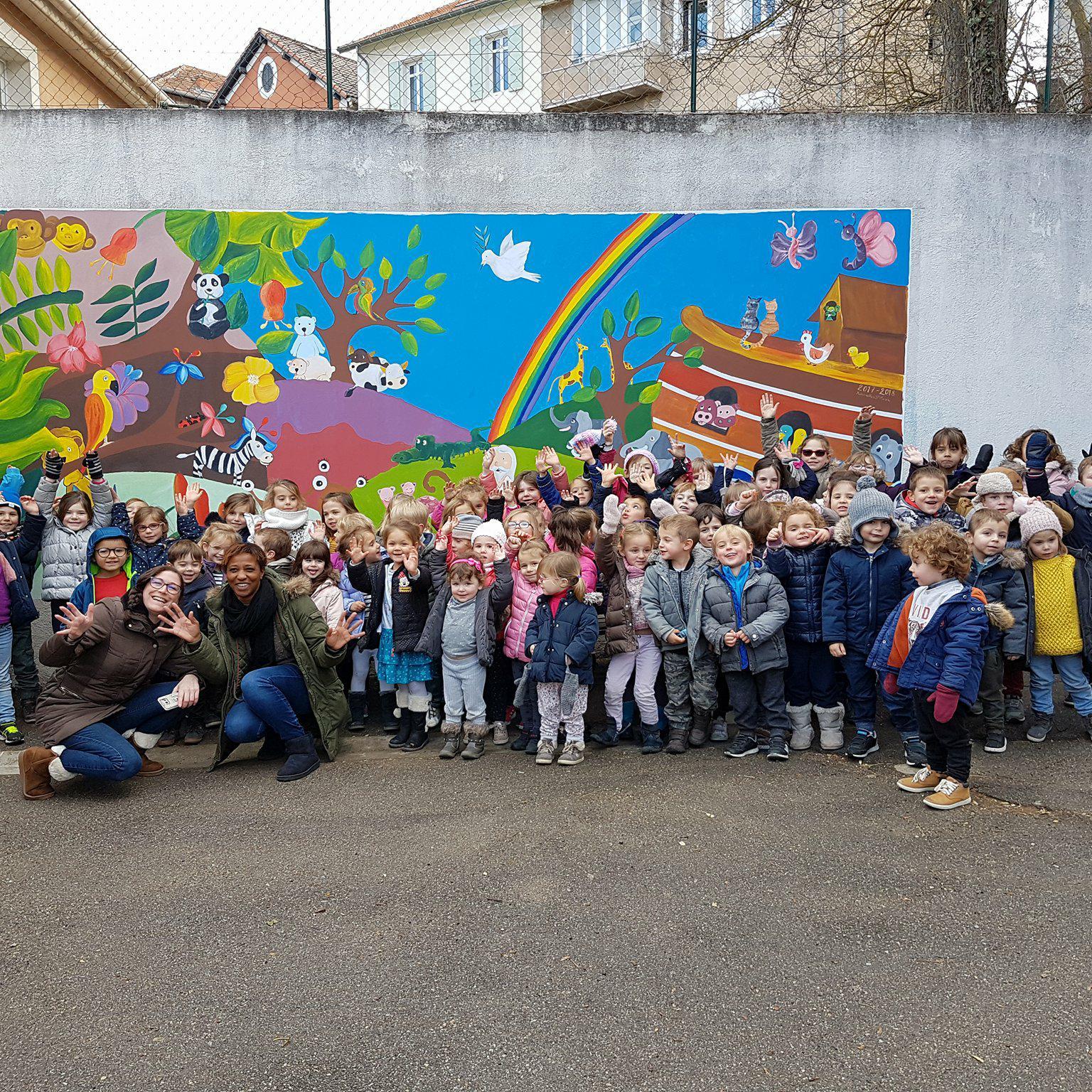 La fresque invite les enfants à travailler ensemble pour atteindre un objectif commun.